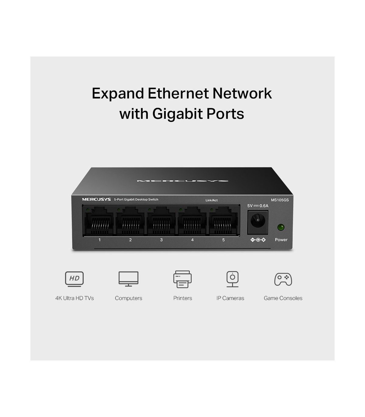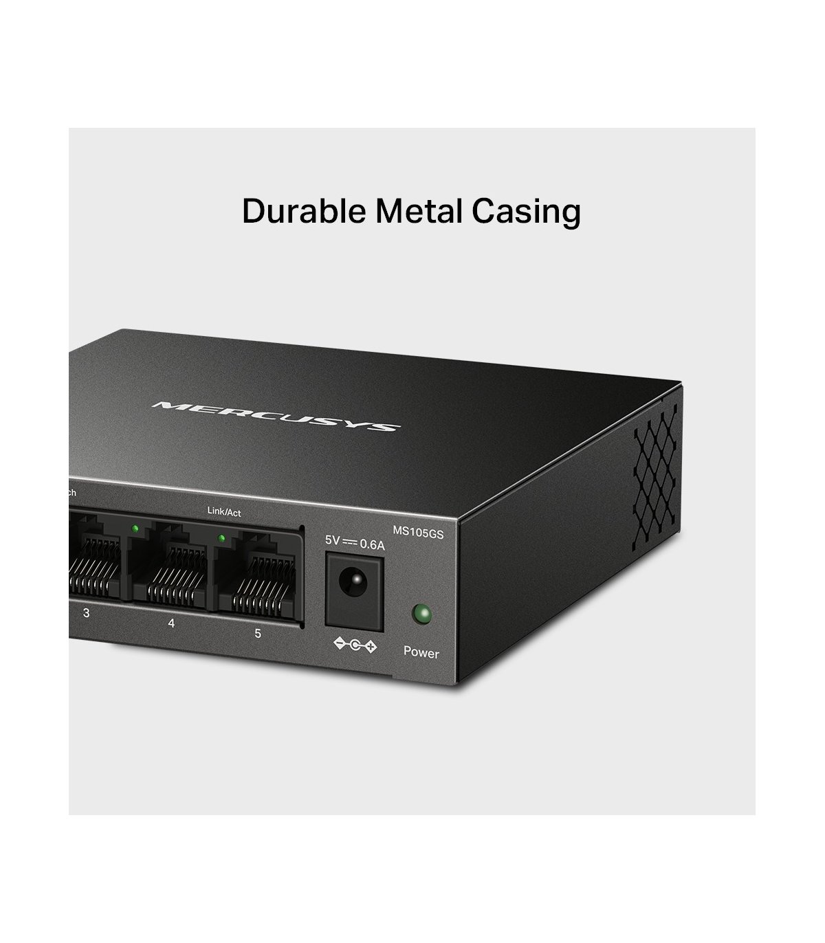 Mercusys MS105GS, No administrado, Gigabit Ethernet (10/100/1000), Bidireccional completo (Full duplex), Montaje de pared/mesa