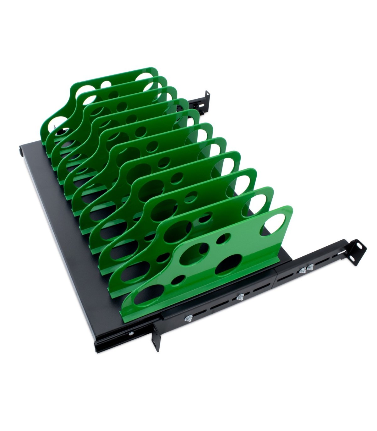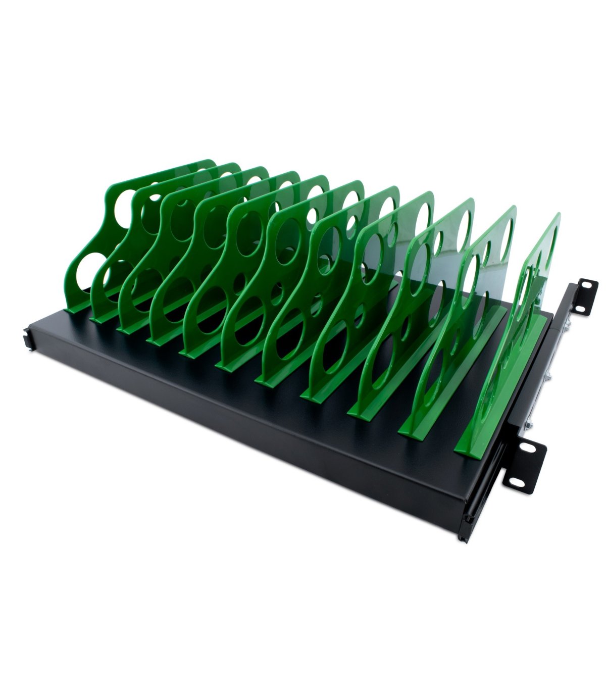 Bandeja extraíble para almacenamiento o carga de portátiles y tablets, válida para armarios de 19″ de hasta 600mm de fondo, dispone de 10 compartimentos para carga de portátiles o tablets, conformados por 11 separadores desmontables para adaptarse al tipo de dispositivo a albergar. El hueco entre los separadores es de 4cm, siendo este el grosor máximo del dispositivo a cargar. Requiere el uso de cargadores no incluidos para cada tipo de dispositivo. Capacidad máxima de carga 20 Kg.