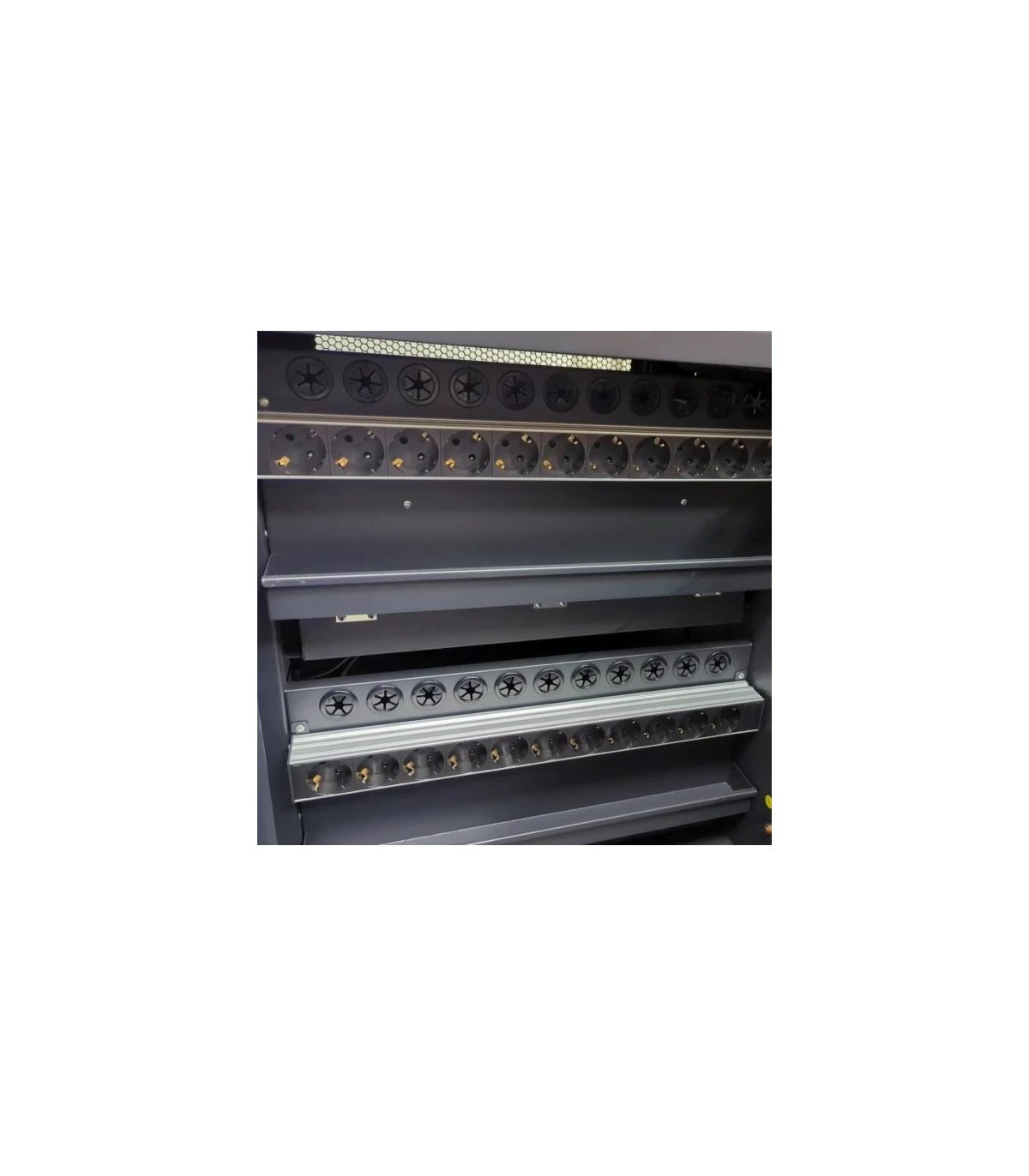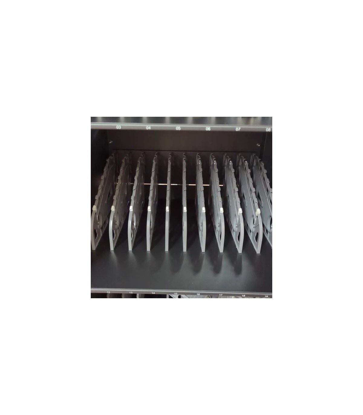 • Estanterías metálicas internas numeradas para organizar los dispositivos.