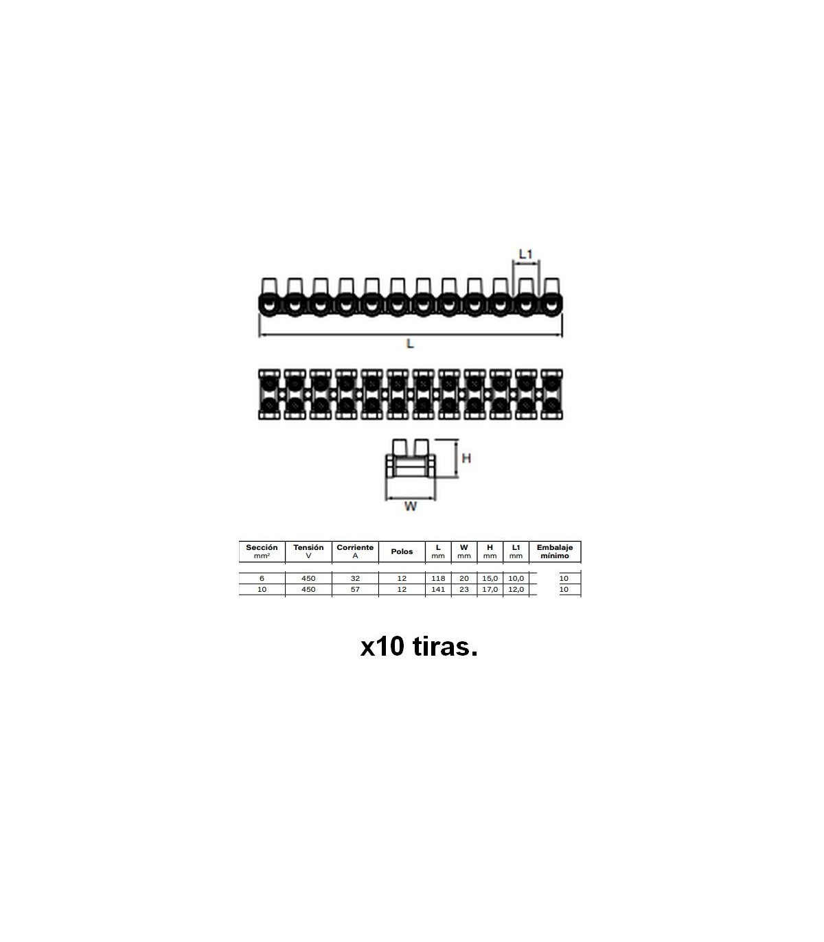 Regletas de polipropileno abocardadas 6 mm. Pack de 10 tiras de 12 polos cada una.