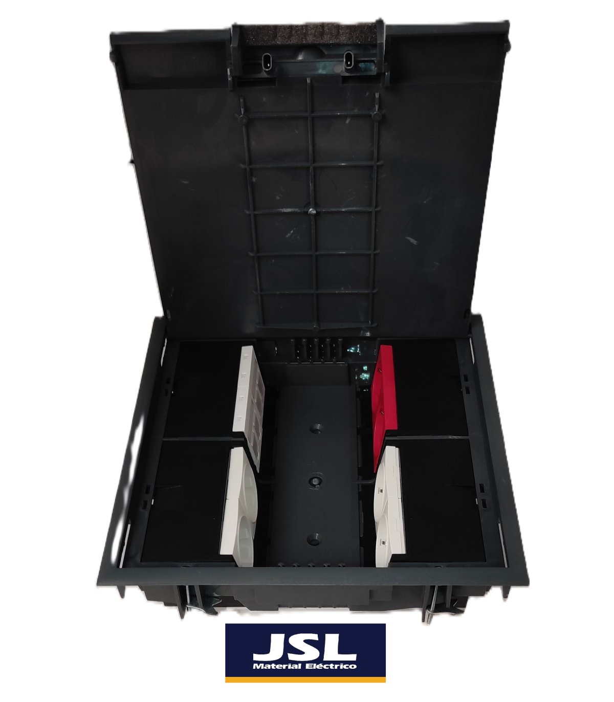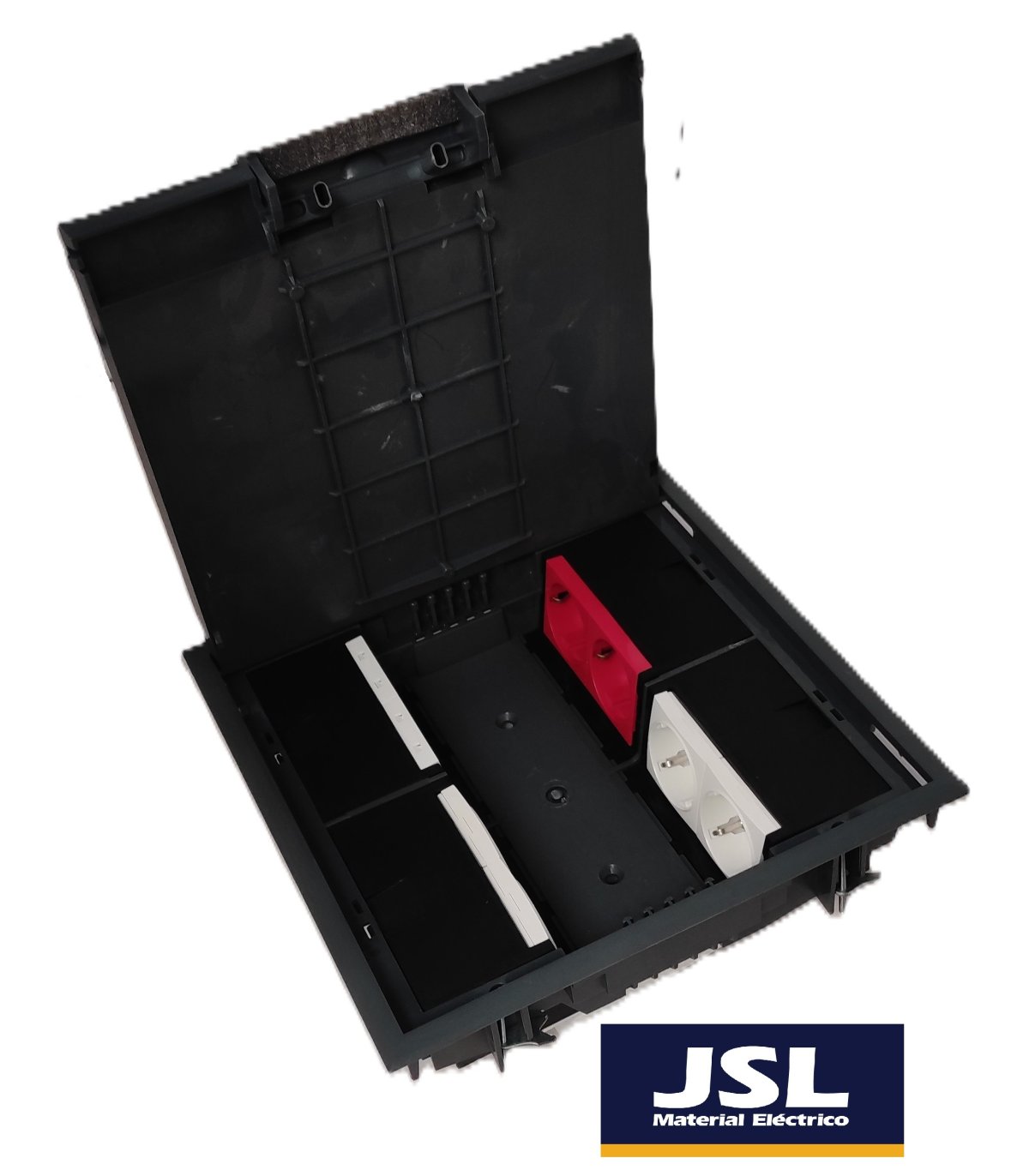 Caja de suelo para interruptores y enchufes de 45×45 en termoplástico de alta resistencia (Nylon 6), con una placa de acero galvanizado en la cubierta para soportar mayores pesos.