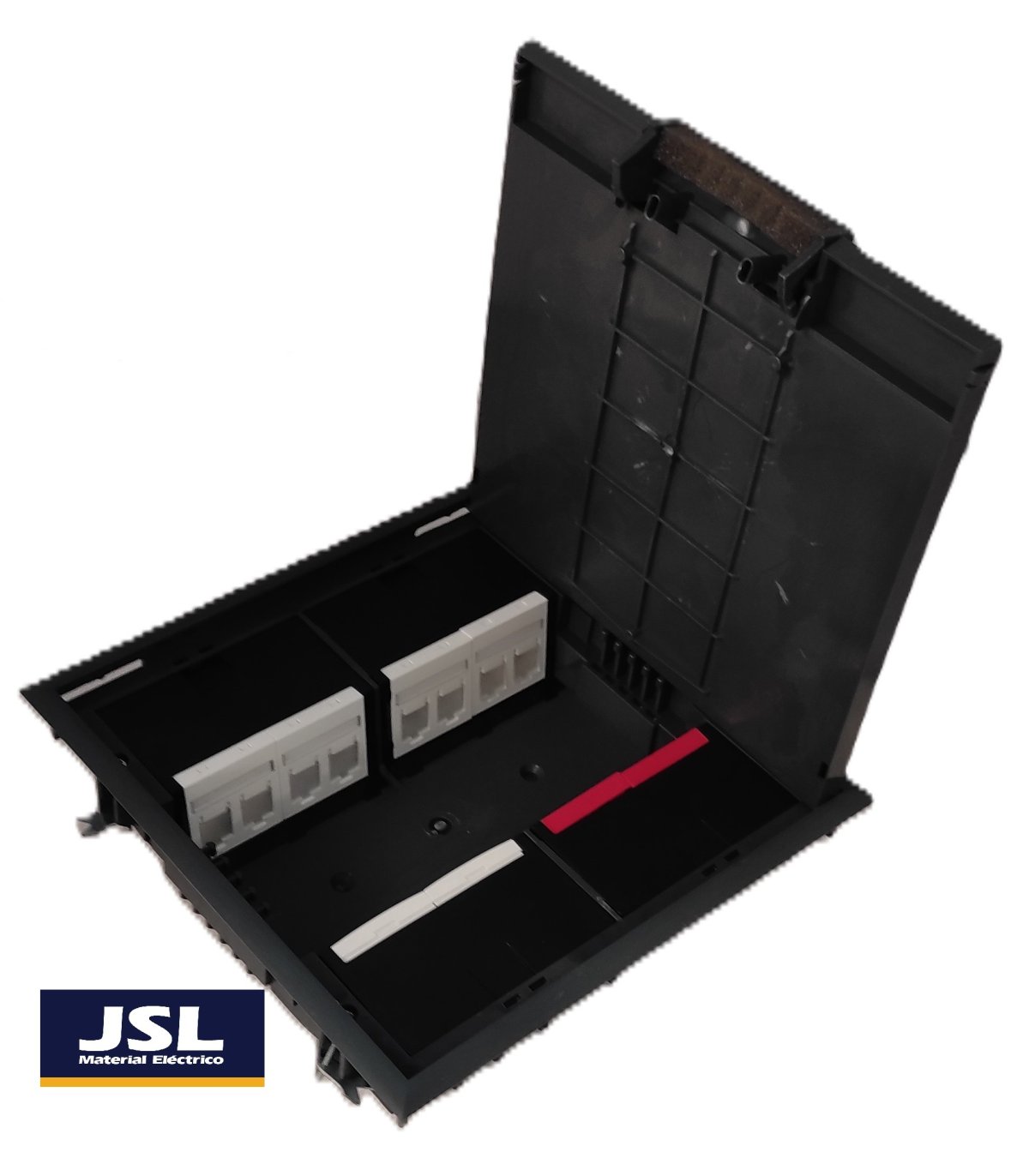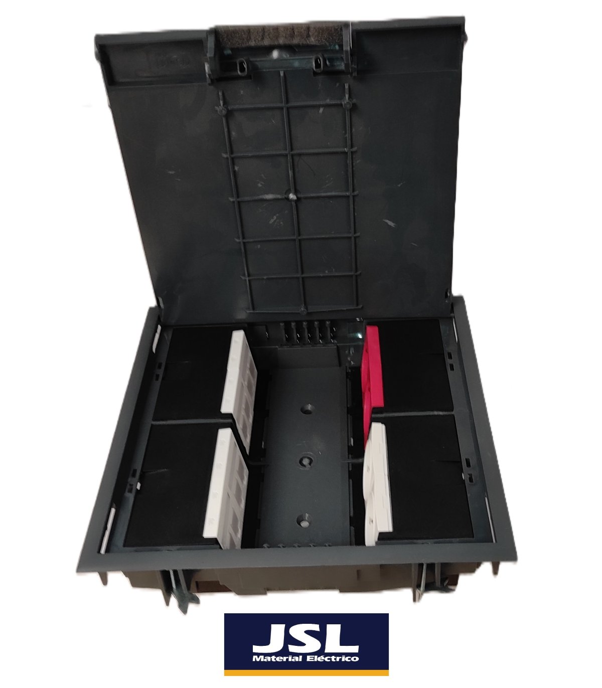 Caja de suelo para interruptores y enchufes de 45×45 en termoplástico de alta resistencia (Nylon 6), con una placa de acero galvanizado en la cubierta para soportar mayores pesos.