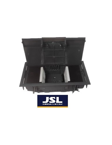 Caja de suelo para interruptores y enchufes de 45×45 en termoplástico de alta resistencia (Nylon 6), con una placa de acero galvanizado en la cubierta para soportar mayores pesos.