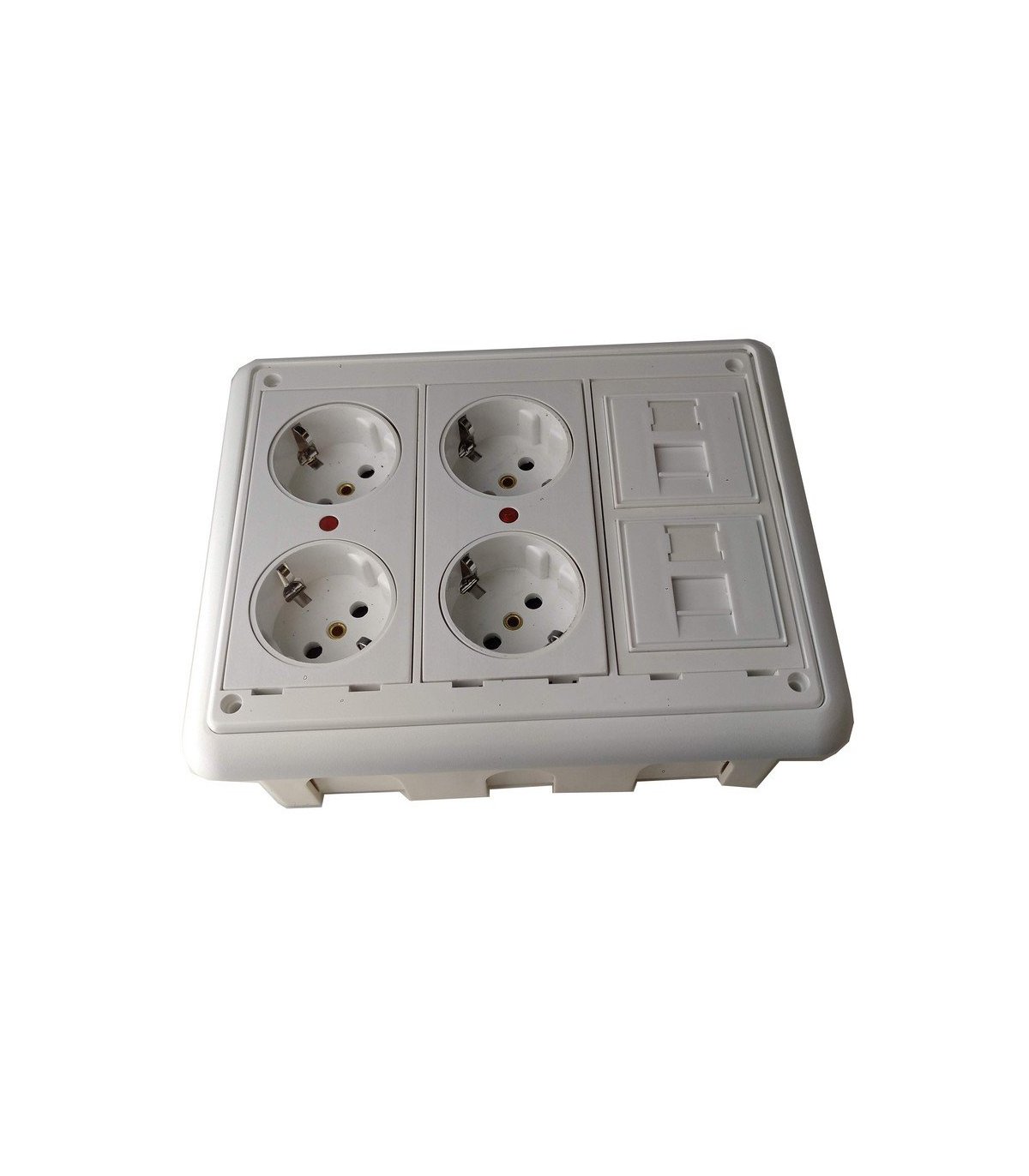 Caja modular de 3 elementos con 2 schukos dobles color blanco y 2 placas para 1 conector RJ45 Univeral