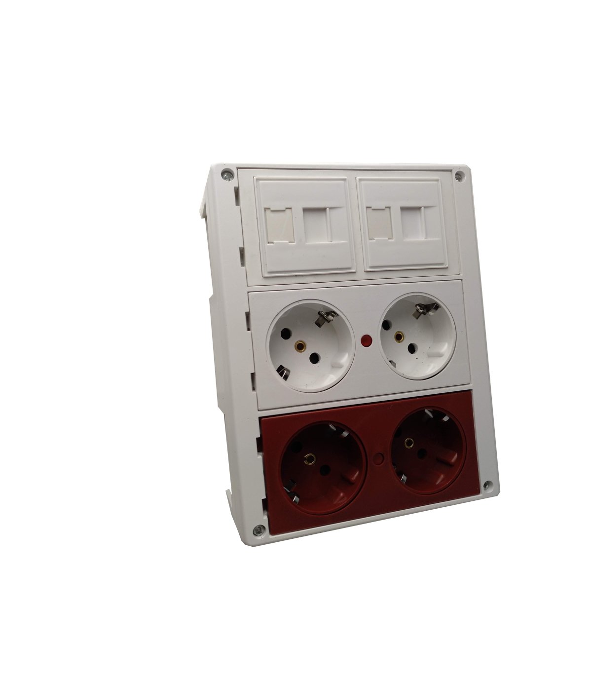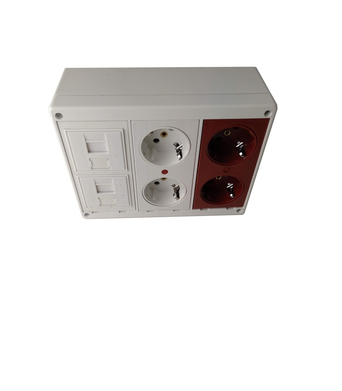 Caja modular de 3 elementos con 1 schuko doble color blanco, 1 schuko doble color rojo y 2 placas para 1 conector RJ45 Universal