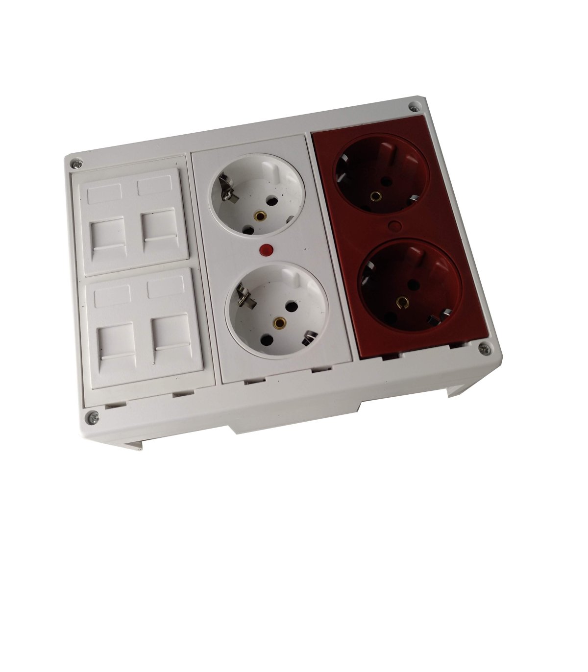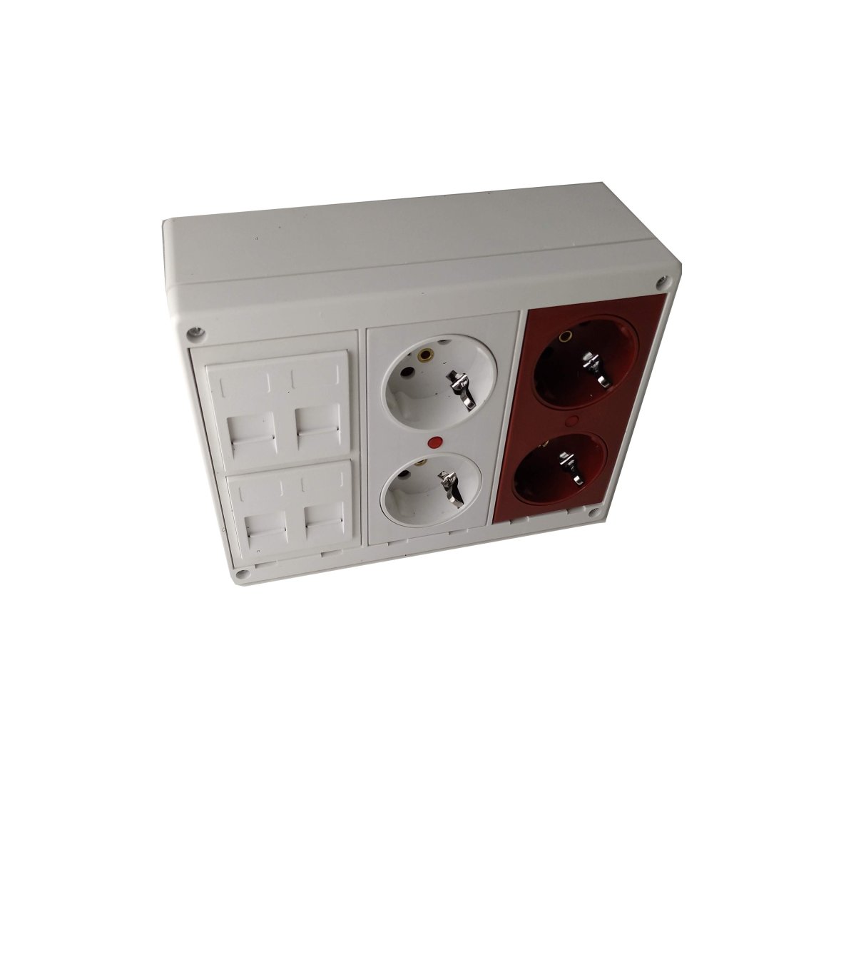 Caja modular de 3 elementos con 1 schuko doble color blanco, 1 schuko doble color rojo y 2 placas para 2 conector RJ45 Universal