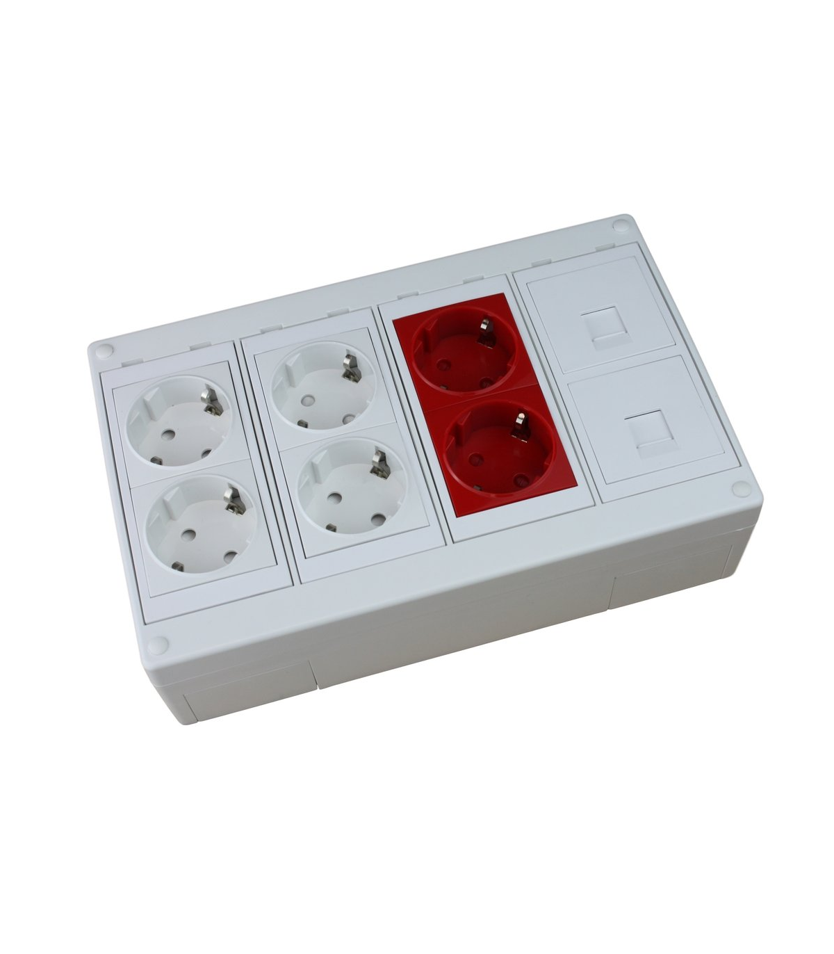 Caja modular de 4 elementos con 2 schukos dobles color blanco, 1 schuko doble color rojo y 2 placas para 1 conector RJ45 Univeral