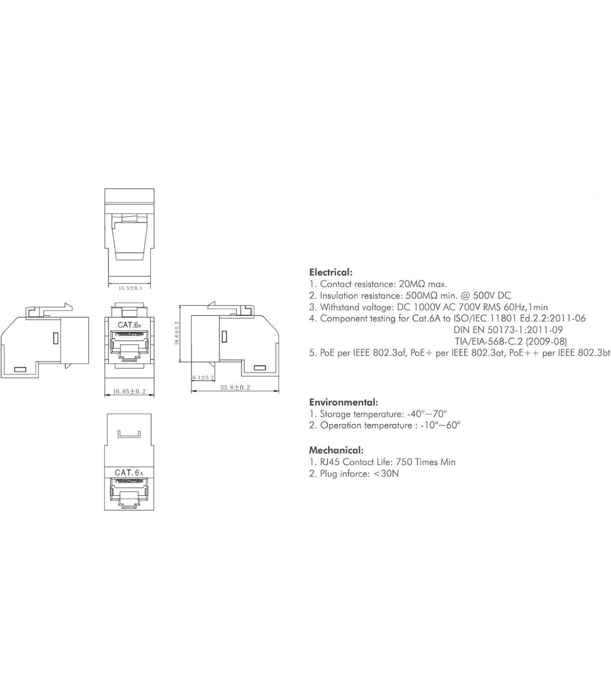 • Vida de inserción: 750 ciclos de acoplamiento con enchufe RJ-45 compatible con FCC.