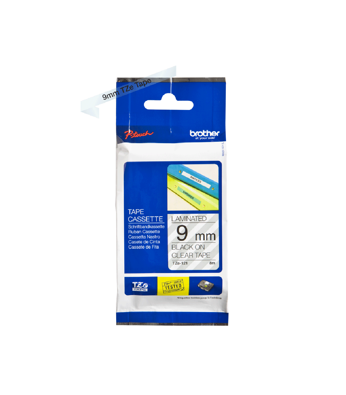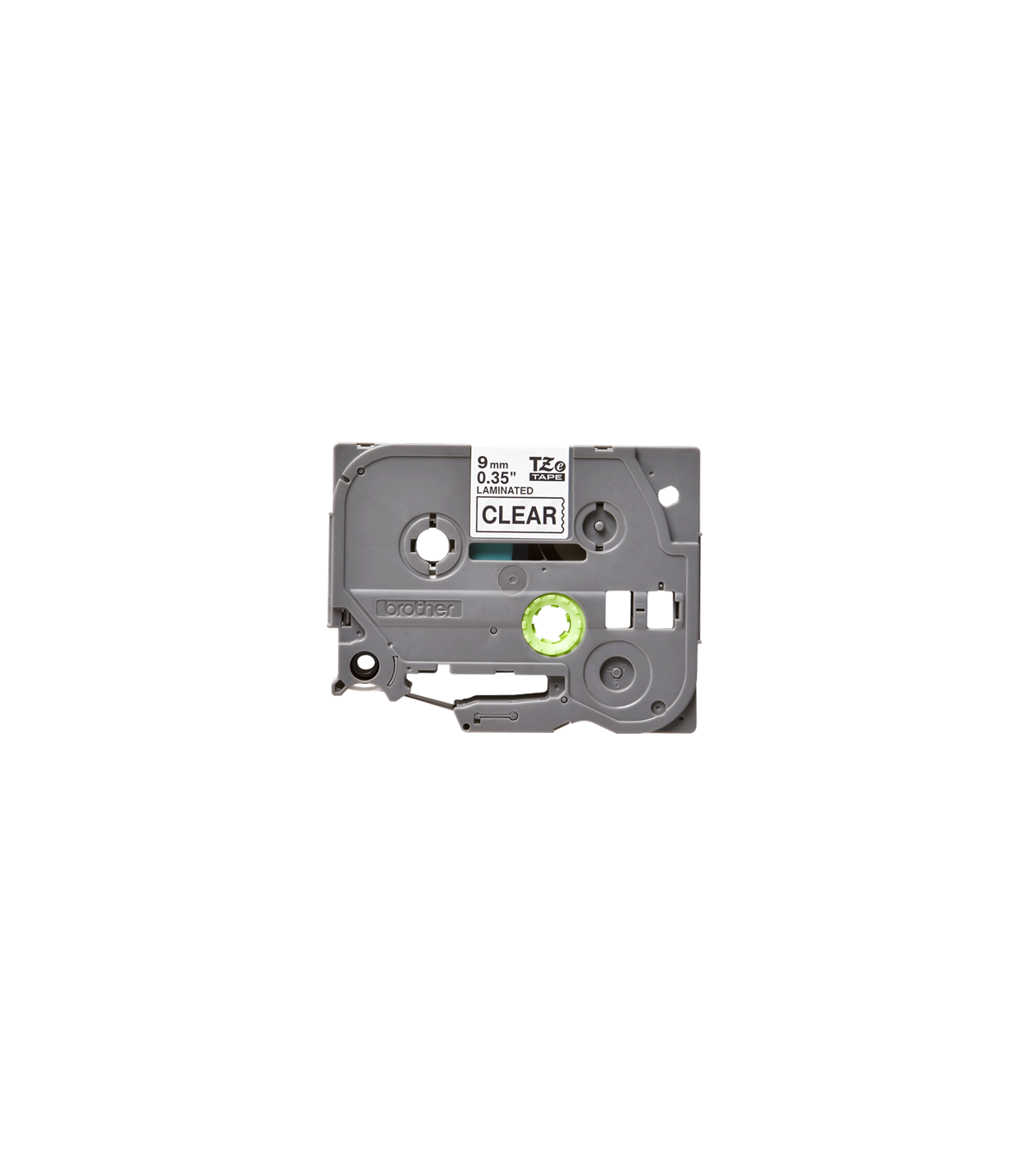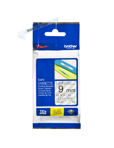 Cinta laminada. Texto negro sobre fondo transparente. Ancho: 9 mm. Longitud: 8 m