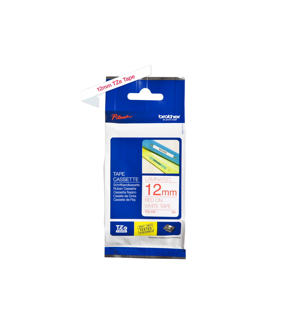 Cinta laminada. Texto rojo sobre fondo blanco. Ancho: 12 mm. Longitud: 8 m