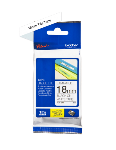 Cinta laminada. Texto negro sobre fondo blanco. Ancho: 18 mm. Longitud: 8 m