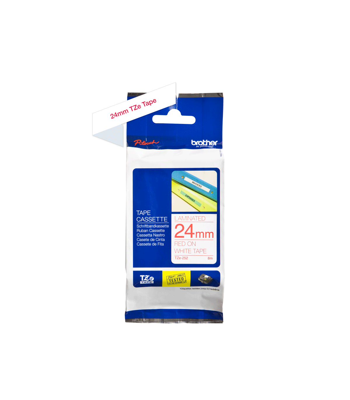 Cinta Laminada Ancho 24 mm Texto Rojo Fondo Blanco