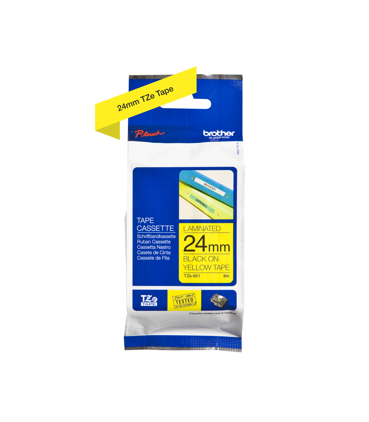 Cinta laminada. Texto negro sobre fondo amarillo. Ancho: 24 mm. Longitud: 8 m