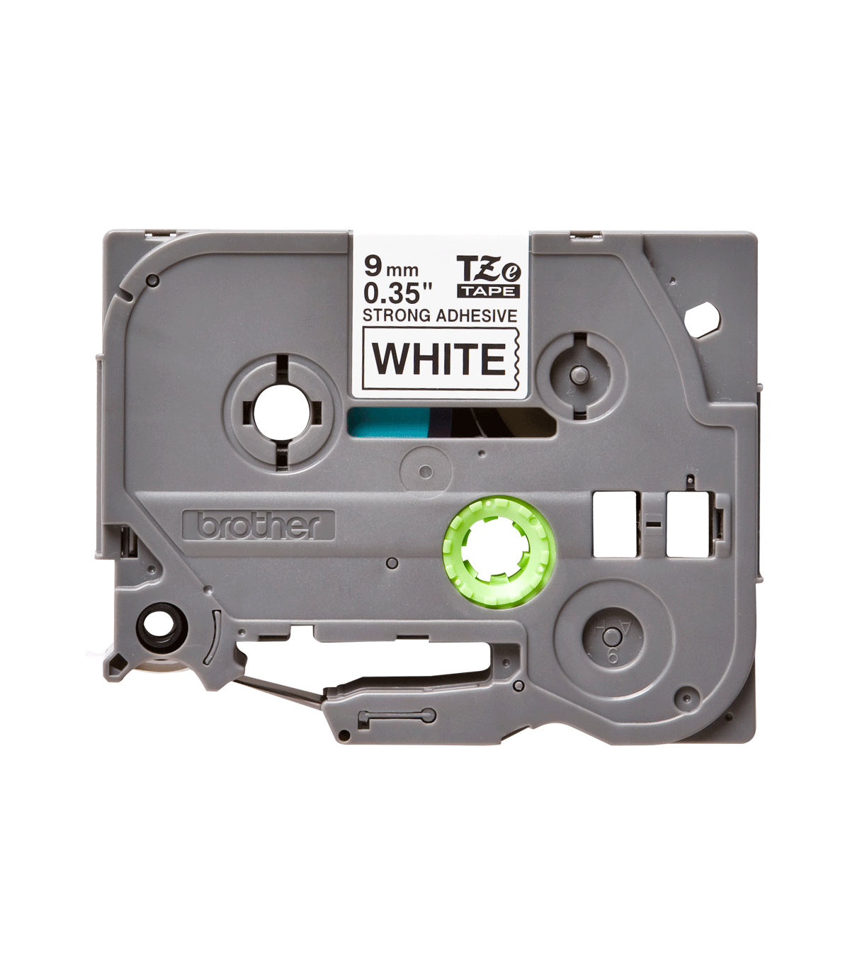 Cinta laminada súper adhesiva. Texto negro sobre fondo blanco. Ancho: 9 mm. Longitud: 8 m
