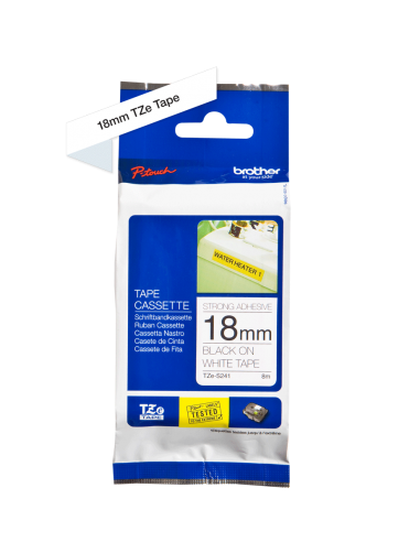 Cinta Laminada Ancho 18 mm súper adhesiva. Texto Negro Fondo Blanco