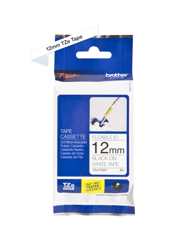 Cinta laminada flexible. Texto negro sobre fondo blanco. Ancho: 12 mm. Longitud: 8 m