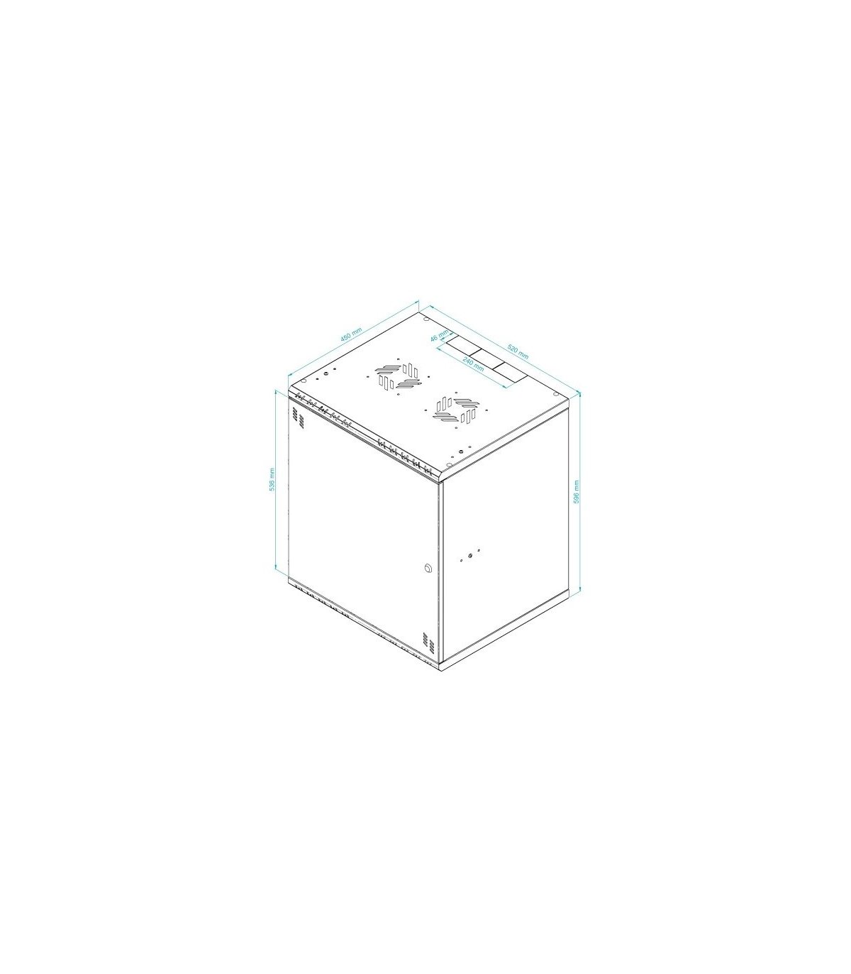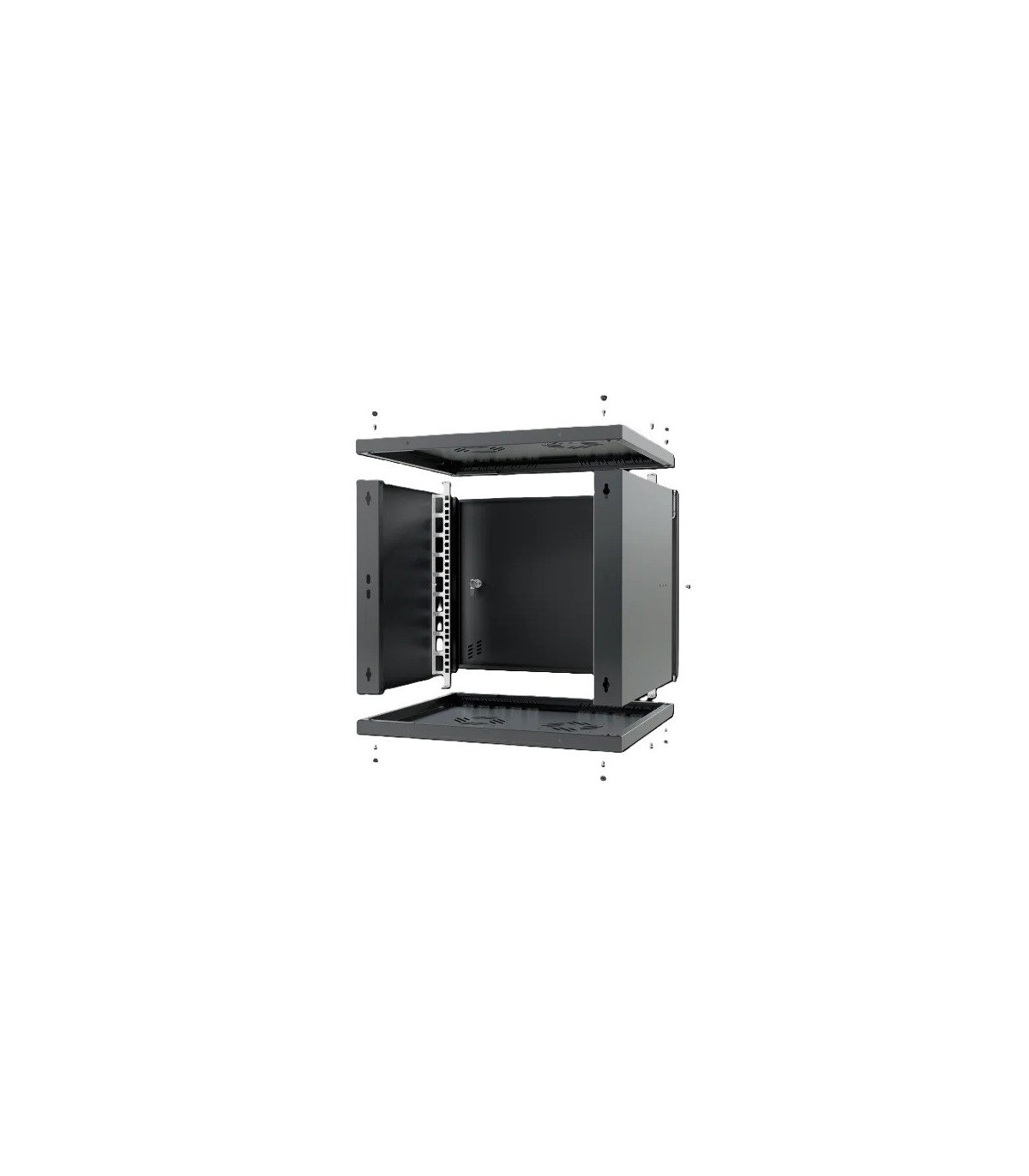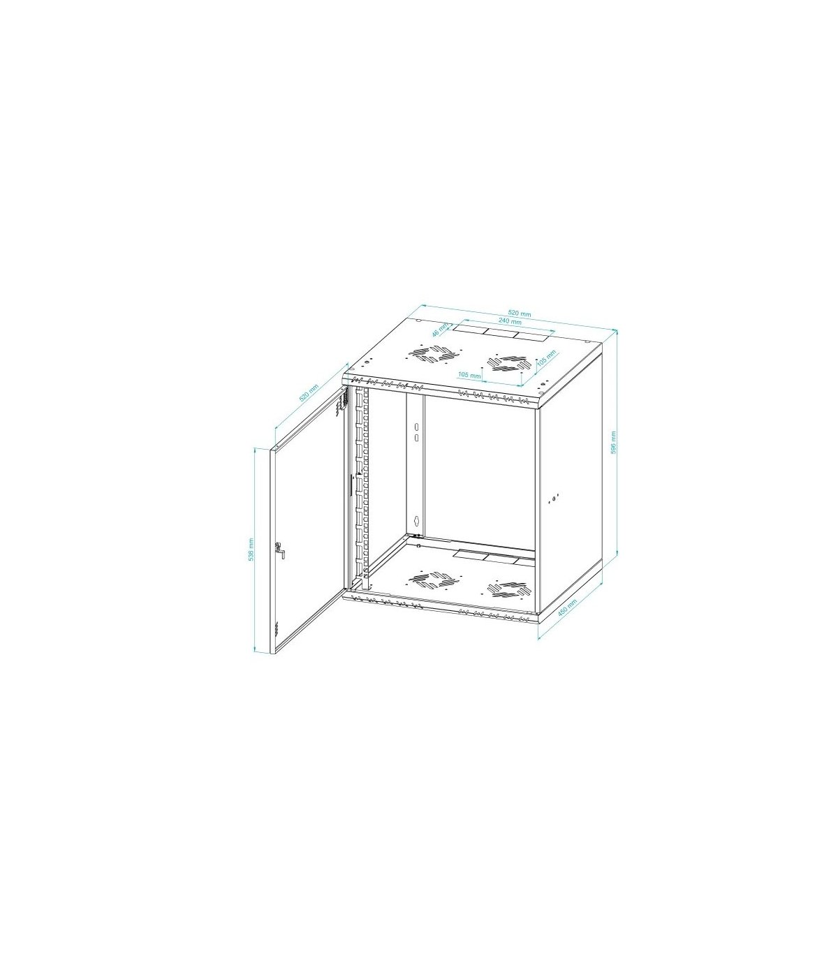 El armario puede atornillarse fácilmente con tacos (no incluidos) gracias a los orificios de la parte posterior. El armario permite un montaje de cuatro puntos en la pared, lo que aumenta su estabilidad. La puerta puede montarse tanto en el lado derecho como en el izquierdo y, gracias a las bisagras especiales con muelle, el montaje y desmontaje es extremadamente sencillo. Los raíles RACK pueden montarse en tres profundidades, lo que permite un ajuste libre de los equipos en su interior. Hay ranuras para ventiladores de 120x120 mm en la parte superior e inferior (distancia entre orificios 105x105 mm) para garantizar una refrigeración adecuada del equipo. Además, los pasacables de 50x80 mm (3 en la parte superior y 3 en la inferior) facilitan la gestión de los cables. El armario está equipado con perforaciones en la parte frontal y los laterales, lo que resulta crucial para la disipación del calor.
