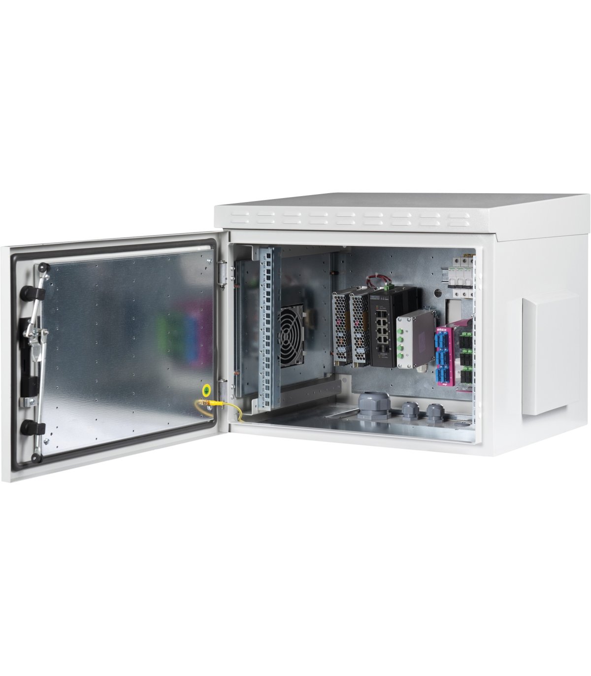 Armario rack de doble pared para exteriores en los que las precipitaciones (lluvia, aguanieve, nieve, salpicaduras de agua), la temperatura o unas condiciones ambientales severas (suciedad, polvo arrastrado por el viento) podrían dañar los componentes internos más sensibles.