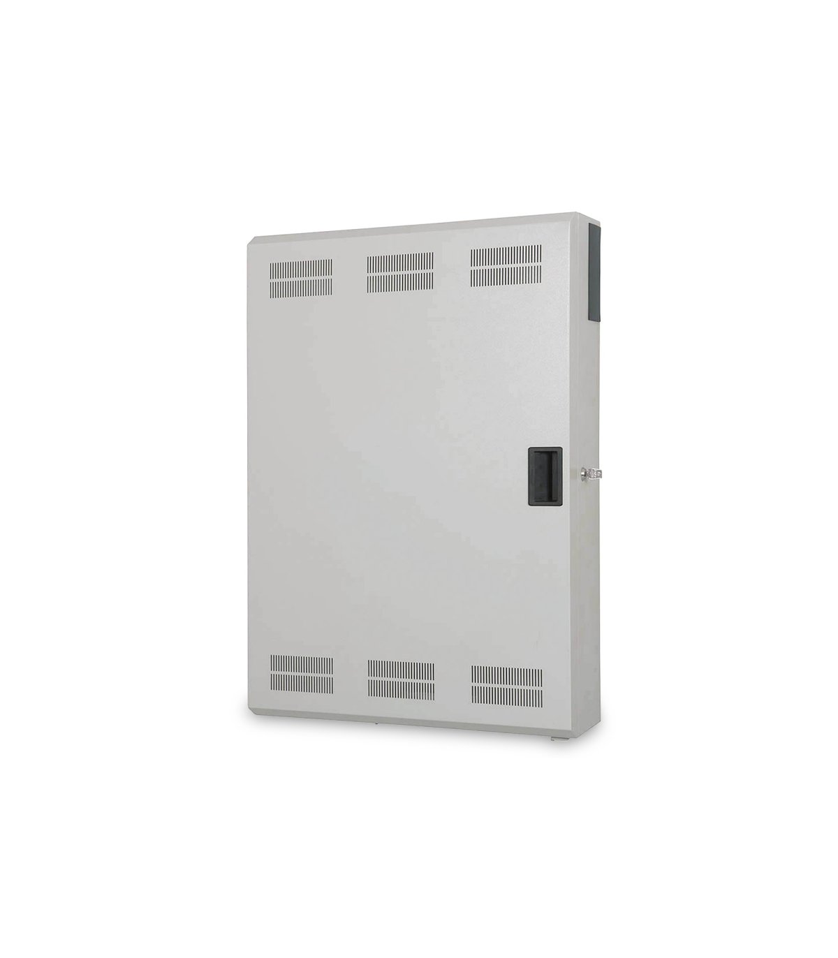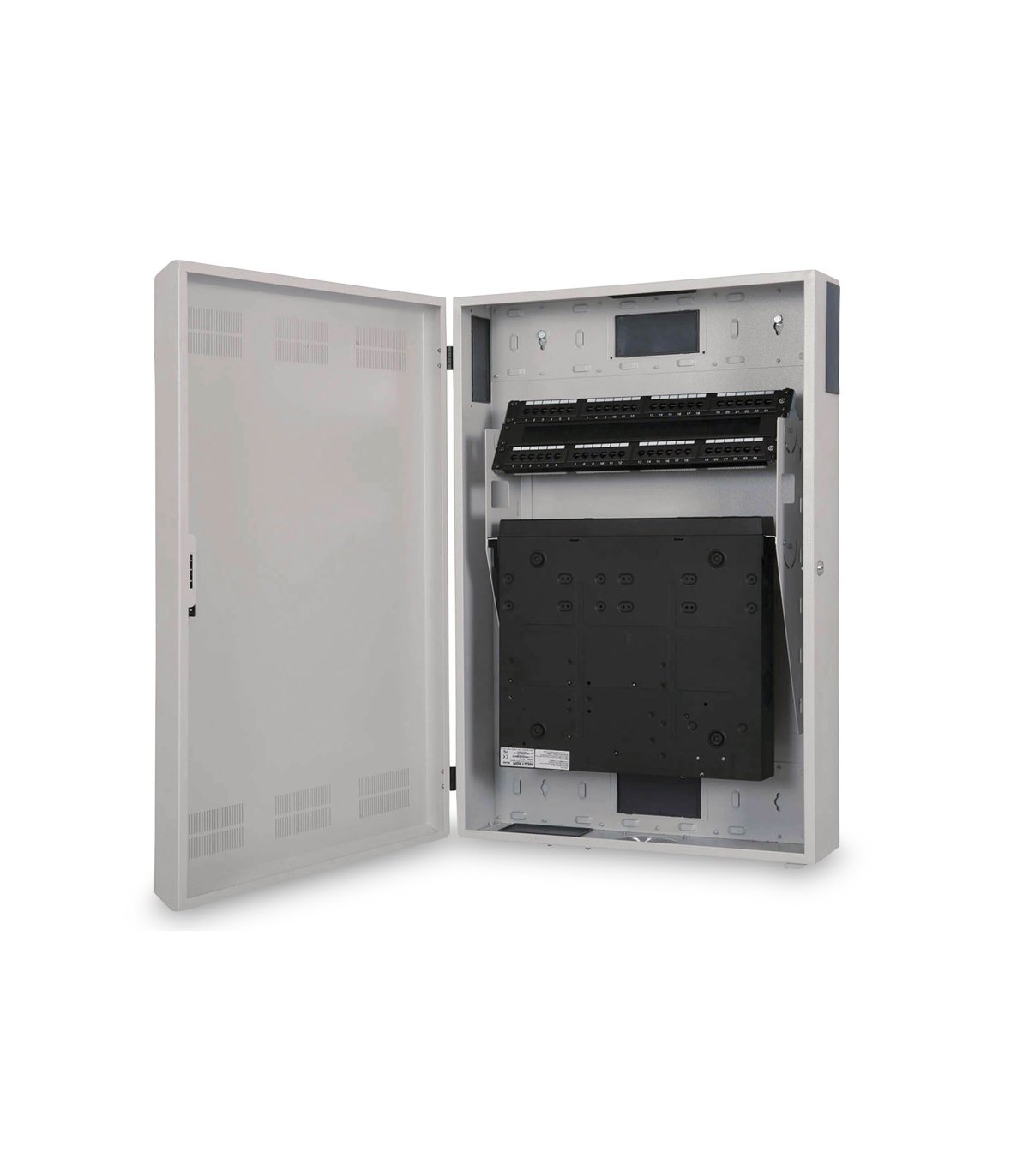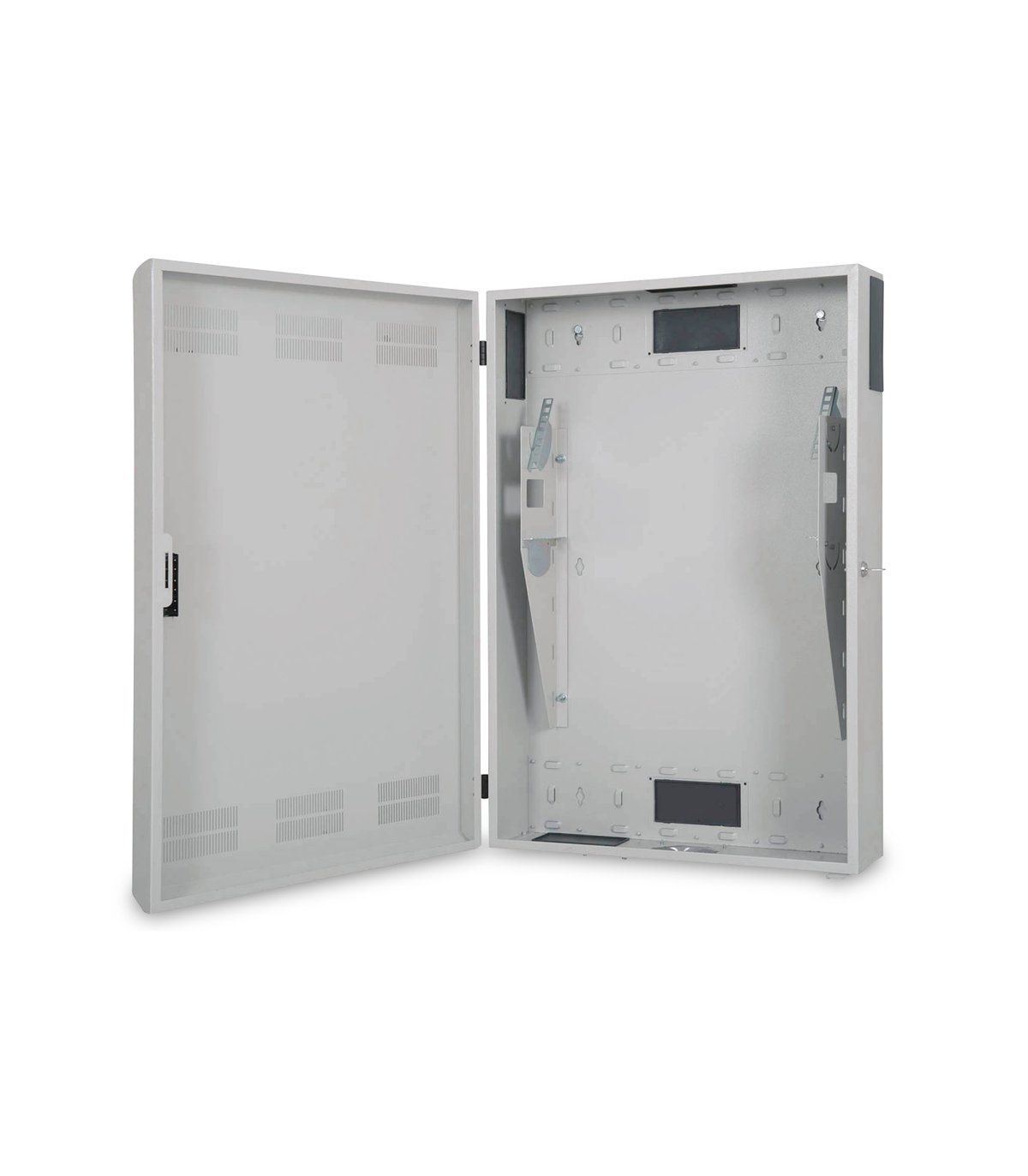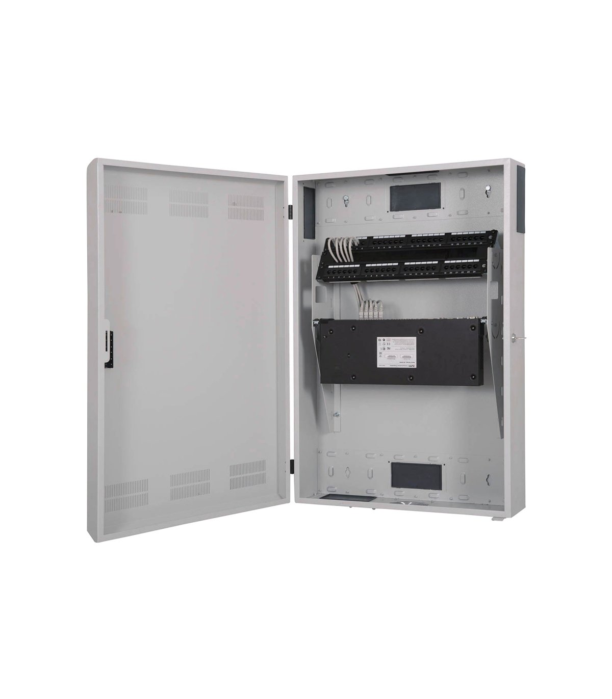 Los armarios de montaje en pared de 483 mm (19 ") de la serie Slim permiten un montaje horizontal o vertical de 3U con dos áreas de montaje independientes para paneles de conexión, interruptores, enrutadores u otros componentes activos de 483 mm (19").