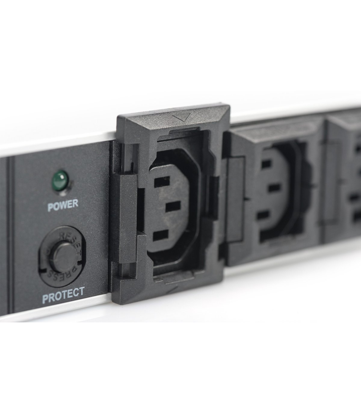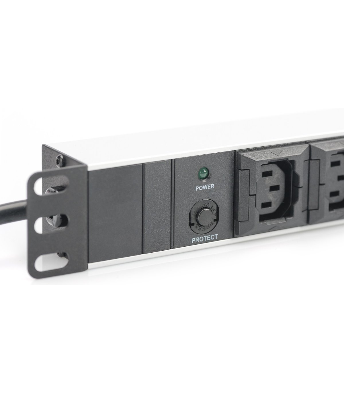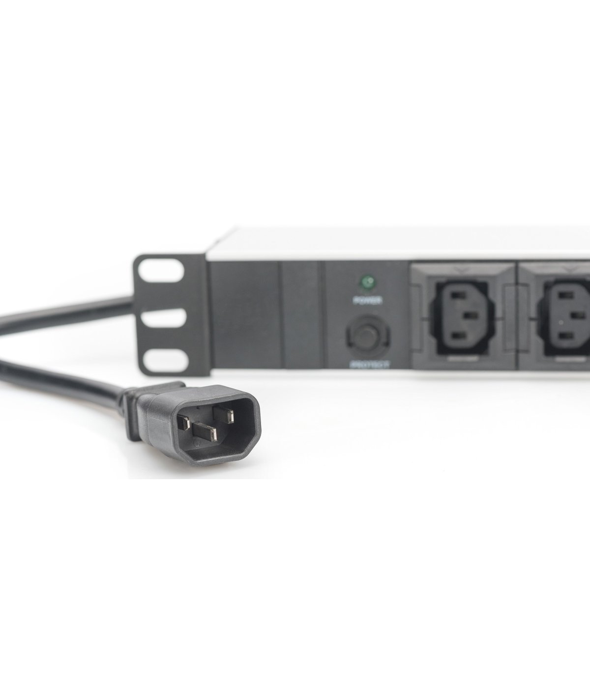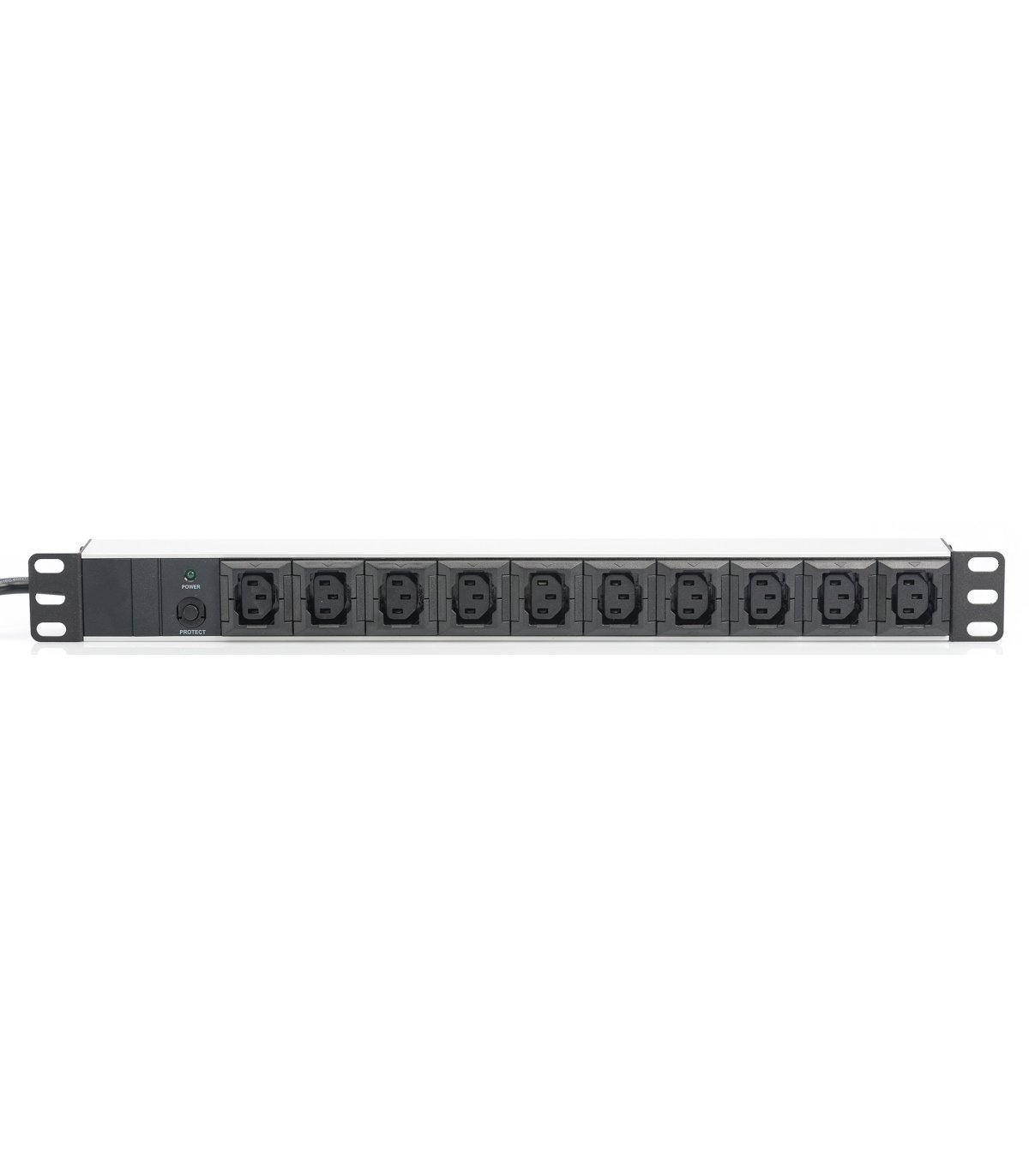 Potencia segura y profesional en la gama de 19" - 10 bases de enchufe IEC C13 250 VAC 50/60 Hz / 10 A / 2500 W - Perfil de aluminio - Protección contra sobrecarga - 2 soportes de montaje incluidos, variable para cambiar de izquierda a derecha - Cable: 2 m H05VV-F 3G1,5 mm² - enchufe IEC C14