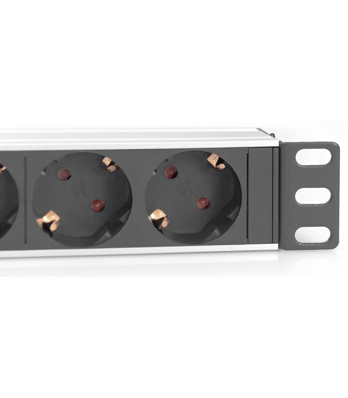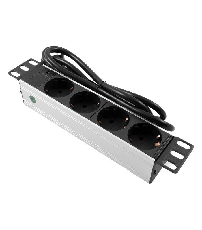 Su altura es de 1U, disponible con 4 tomas tipo schucko y todas ellas con certificación alemana VDE en las conexiones. Las bases de enchufes o PDU (Power Distribution Unit) están diseñadas para ser instaladas en armarios rack, aunque también pueden ser utilizadas de forma independiente.