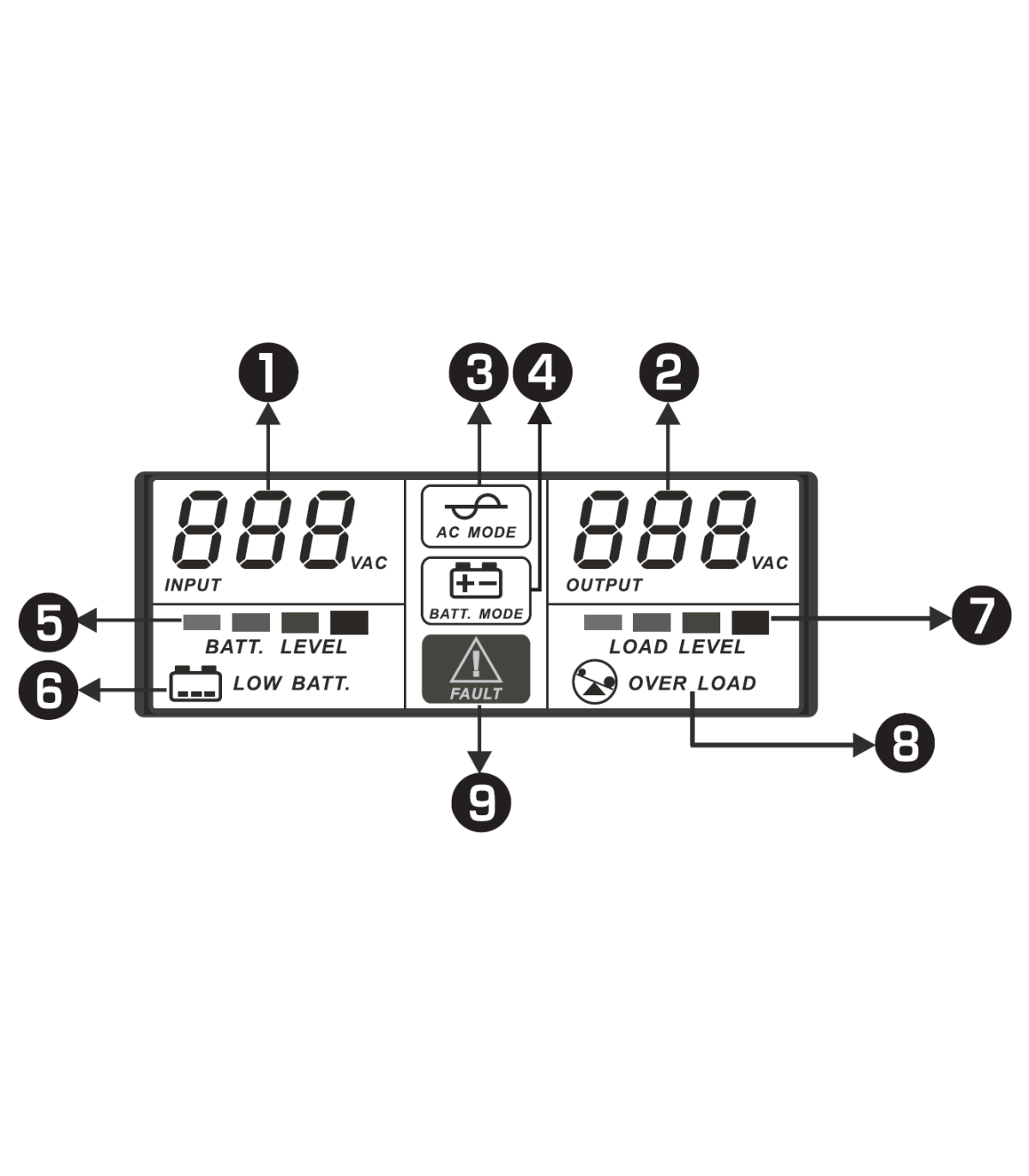 LCD con toda la información sobre el funcionamiento del equipo (tensión entrada/salida, % de carga, %