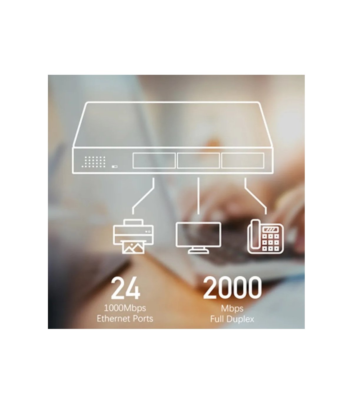 Un Switch de 24 GbE con capacidades VLAN/Extensión y sistema de refrigeración sin ventilador.