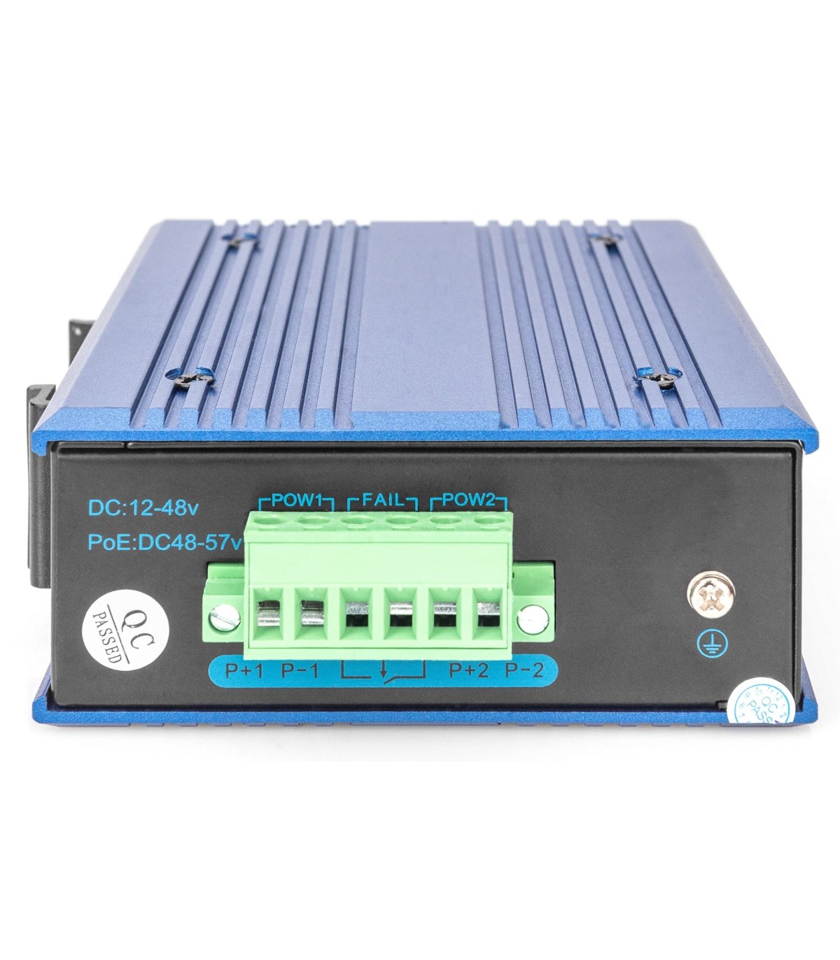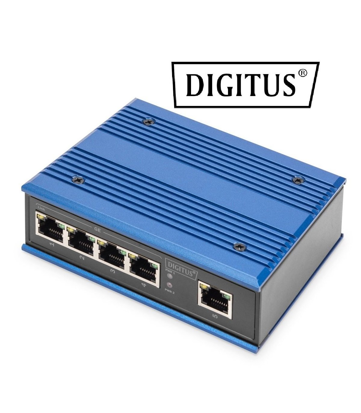 • El conmutador Ethernet industrial posee 5 puertos RJ45 con velocidad Gigabit Ethernet y viene con una carcasa metálica robusta y compacta en los colores negro y azul