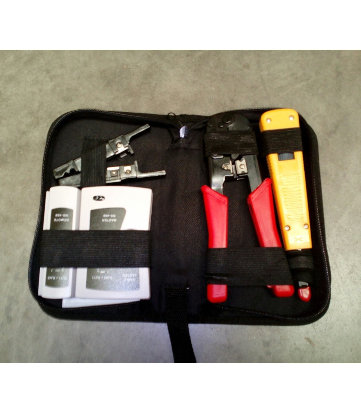 Maletín con testeador de cable de red para RJ45, RJ11, RJ12, herramienta de crimpar, pela cables y herramienta de impacto 110.