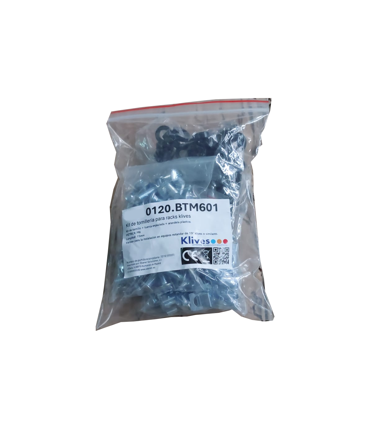 TORNILLERÍA tipo Phillips, especialmente diseñada para fijar periféricos y accesorios compatibles con los bastidores de los armarios rack y piezas para unión de armarios que permiten agrupar armarios en batería fijando sus laterales.